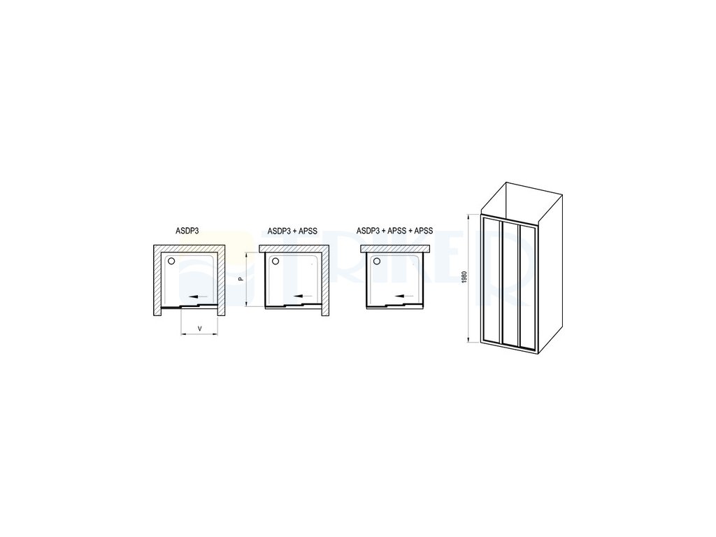 Kombinací s jednou pevnou stěnou typu APSS vytvoříme sprchový kout ve tvaru „L“, kombinací se dvěma stěnami typu APSS vytvoříme sprchový kout ve tvaru „U“. Případné nerovnosti stavebního otvoru lze kompenzovat nastavovacími profily ANPS. Ostatní rozměry a varianty sprchových dveří řešíme na míru.