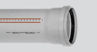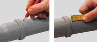 4/ Rovný díl trubky zasuňte až nadoraz do hrdla. Poté si na rovném okraji trubky označte tužkou či fixem okraj hrdla a tuto značku povysuňte asi o 10 mm zpět. Tím umožníte dilataci potrubí. Vzhledem k tomu, že trubky s hrdly jsou dlouhé maximálně 2000 mm, výše zmíněná hodnota by měla být dostačující. V případě použití delších trubek (například 5000 mm bez hrdla) je nutné vždy zařadit kompenzátor - prodloužené hrdlo. Rovné konce tvarovek mohou být zasunuty do hrdel úplně.