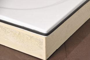 5/ Lištu natlačíme do spáry mezi vaničku či vanu a stěnu tak, aby těsně přilehla na horní okraj výrobku a obklad. Lištu zatížíme. Podle potřeby tmel po zaschnutí odstraníme