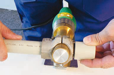 - Po uplynutí nahřívací doby vyjmeme ze svařovacího nástavce tvarovku i trubku a spojíme tak, že trubku mírným pomalým stejnoměrným tlakem zasuneme bez pootočení osově do objímky tvarovky až po hloubku zasunutí. Zkontrolujeme osové spojení trubky s tvarovkou.