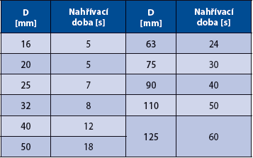 - Doba prohřívání se měří od chvíle, kdy jsou trubka i tvarovka nasunuty na svařovacím nástavci v plné délce, která byla vyznačena. Při špatném zasouvání trubky a tvarovky na trn je možné mírné otáčení obou dílů (max. 10°), než jsou nasunuty v požadované délce. Během prohřívání není dovoleno žádné pootáčení, aby nedošlo ke shrnování materiálu.