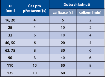 V případě překročení uvedené doby hrozí nebezpečí ochlazení natavené vrstvy a vytvoření nekvalitního studeného spoje. Čerstvý spoj fixujeme a necháme zchladnout dle časových údajů ve výše uvedené tabulce. Poté již nemůže dojít k povyjetí trubky z tvarovky, způsobené svařovacím tlakem a změně polohy tvarovky vůči trubce.