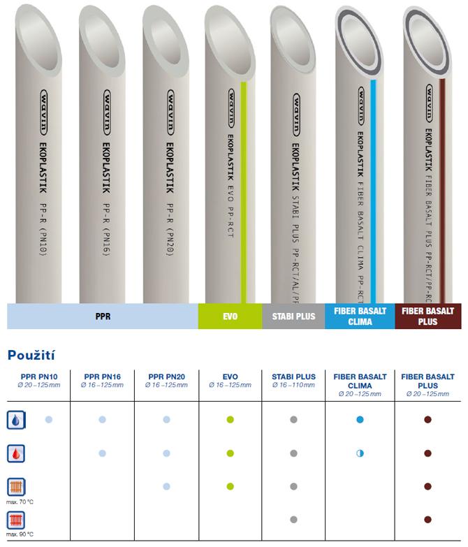 Předpokladem kvalitního systému pro rozvod vody nebo topení je správný výběr PPR trubky. Systém PPR dodáváme od značkového českého výrobce Wavin Ekoplastik, který nabízí následující trubky: