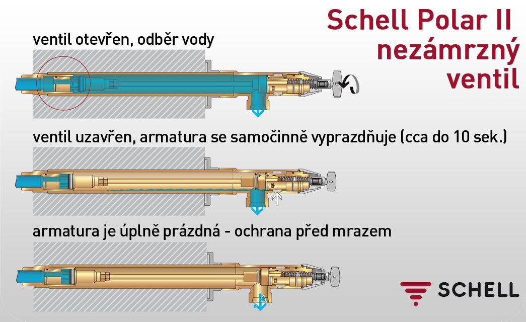 Nezámrzný, mrazuvzdorný ventil POLAR II od renomovaného německého výrobce Schell usnadňuje uživatelům život: odpadá totiž únavné a nepohodlné uzavírání přívodních ventilů před příchodem mrazů a vypouštění vody ze všech ventilů umístěných venku na místech, jako jsou terasy, garáže nebo zahrady.