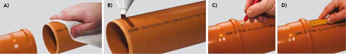 A) Rovný konec i hrdlo trubky zbavte případných nečistot. B) Zkontrolujte bezvadnost a správnost založení těsnícího kroužku. C) Rovný konec trubky natřete montážním mazivem, které je součástí nabízeného systému. D) Rovný konec trubky zasuňte do hrdla až nadoraz. Poté si na rovném konci trubky označte okraj hrdla (např. fixem nebo tužkou). Rovný konec následně povytáhněte z hrdla o 3mm na každý 1m stavební délky trubky, minimálně však o 10 mm.