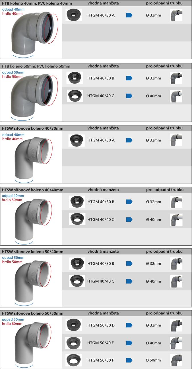 Pro dopojení sifonů je vhodné použití HTGM manžet, které lze zasunout do sifonových kolen HTSW, nebo do klasických kolen HTB. V přehledu, který naleznete níže je soupis dostupných HTGM manžet a jejich použití.