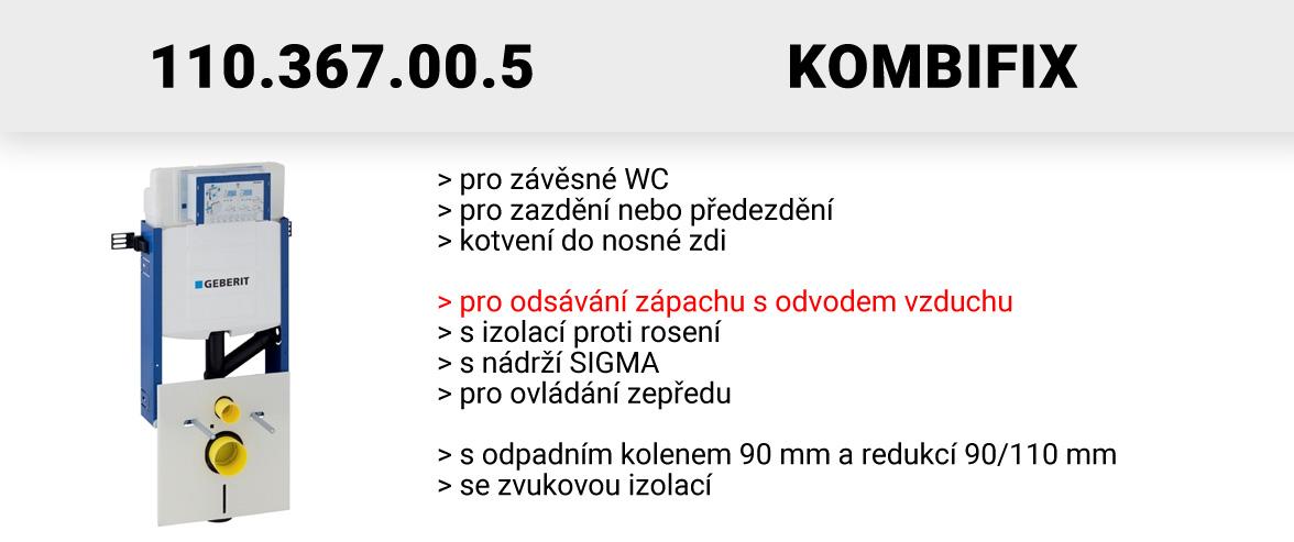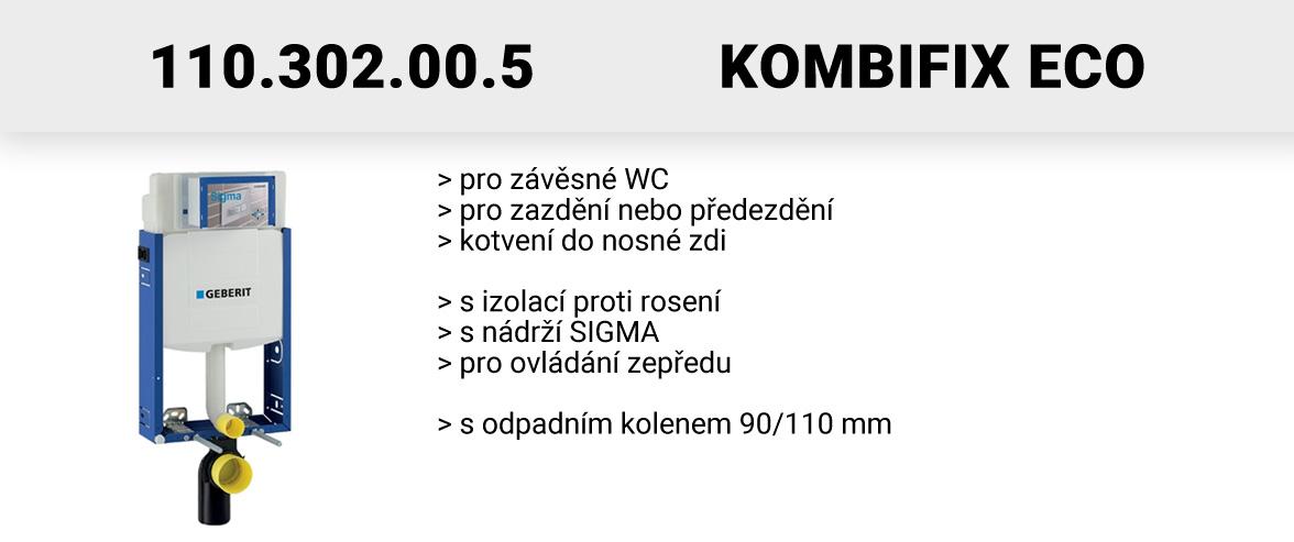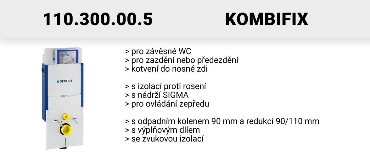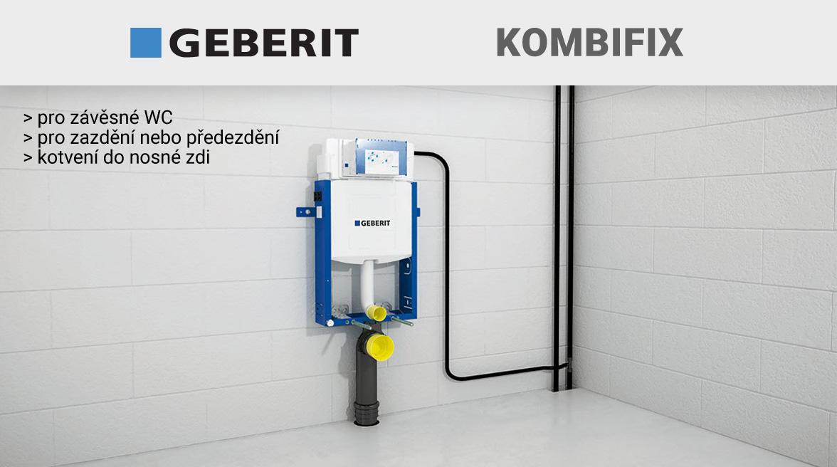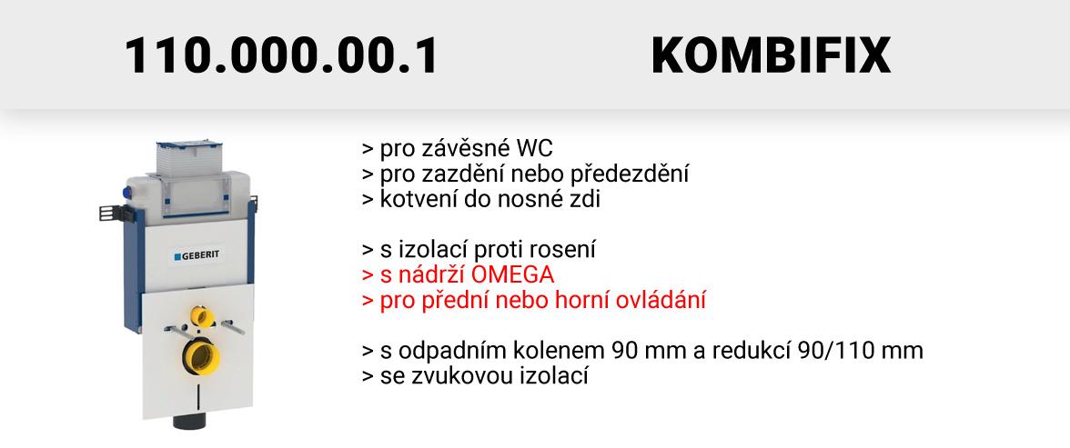 Geberit Kombifix patří mezi nejpoužívanější prvky. Je vhodný pro novostavby a rekonstrukce - všude tam, kde je možné kotvení do nosné zdi a následné zazdění nebo předezdění. Modul lze následně osadit běžným závěsným WC klozetem (rozteč šroubů 18 cm). Splachovače Geberit Kombifix jsou osazeny buď nádrží Sigma (přední ovládání, možnost vhazování tablet do nádrže) a Omega (přední nebo horní ovládání, bez možnosti vhazování tablet). Upozorňujeme na to, že nelze kombinovat nádrž Sigma s tlačítky Omega a opačně! Níže jsou uvedeny základní modely a jejich hlavní vlastnosti:
