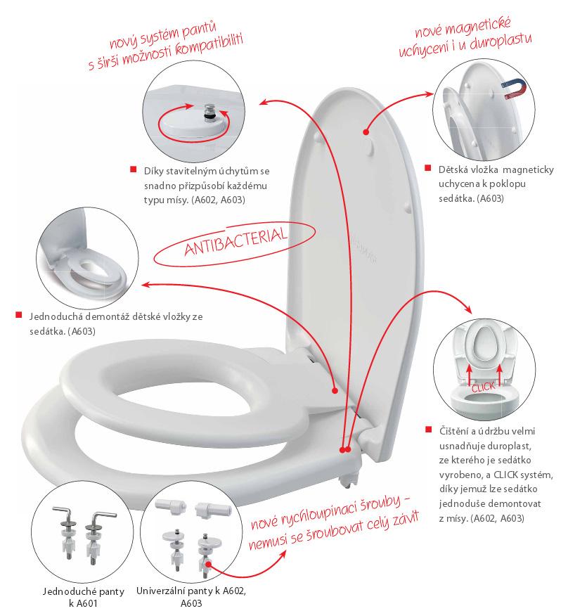 Sedátko je vyrobené z pevného materiálu - duroplastu, který je snadný na údržbu. Materiál sedátka se vyznačuje antibakteriální úpravou.