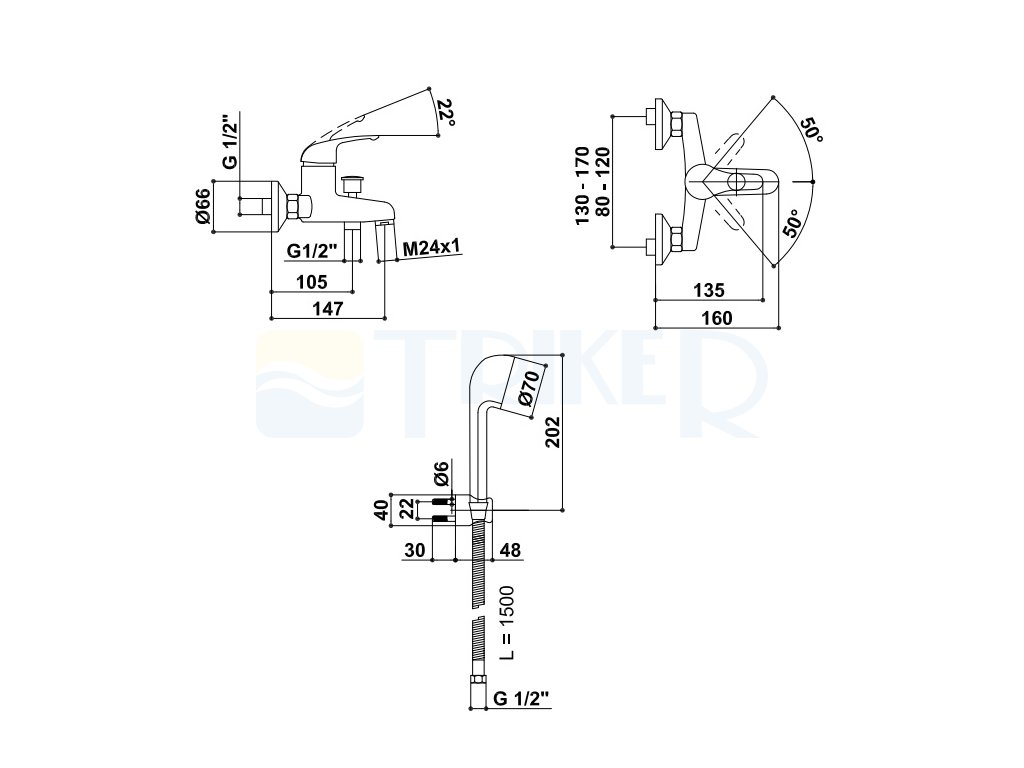 • s jednopolohovou ruční sprchou, sprchovou hadicí 150cm a pevným držákem sprchy