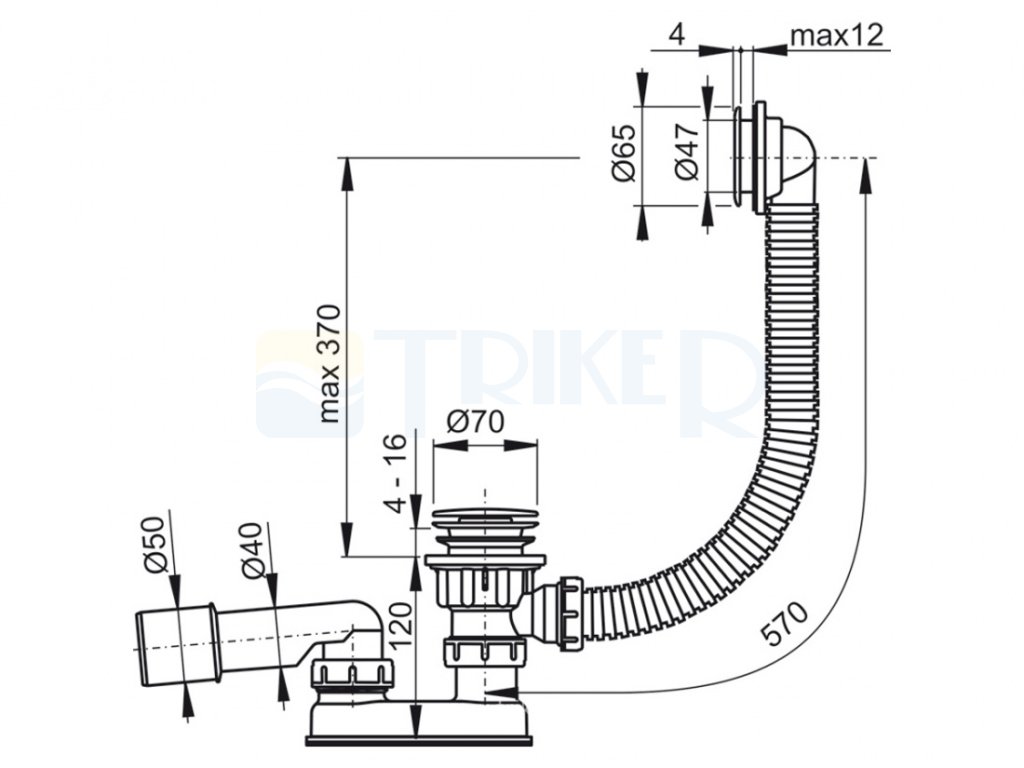 Sifon vanový klik-klak A505CRM velká zátka:plast, přepad:plast,odpad 50/40mm, délka přepadu 570mm