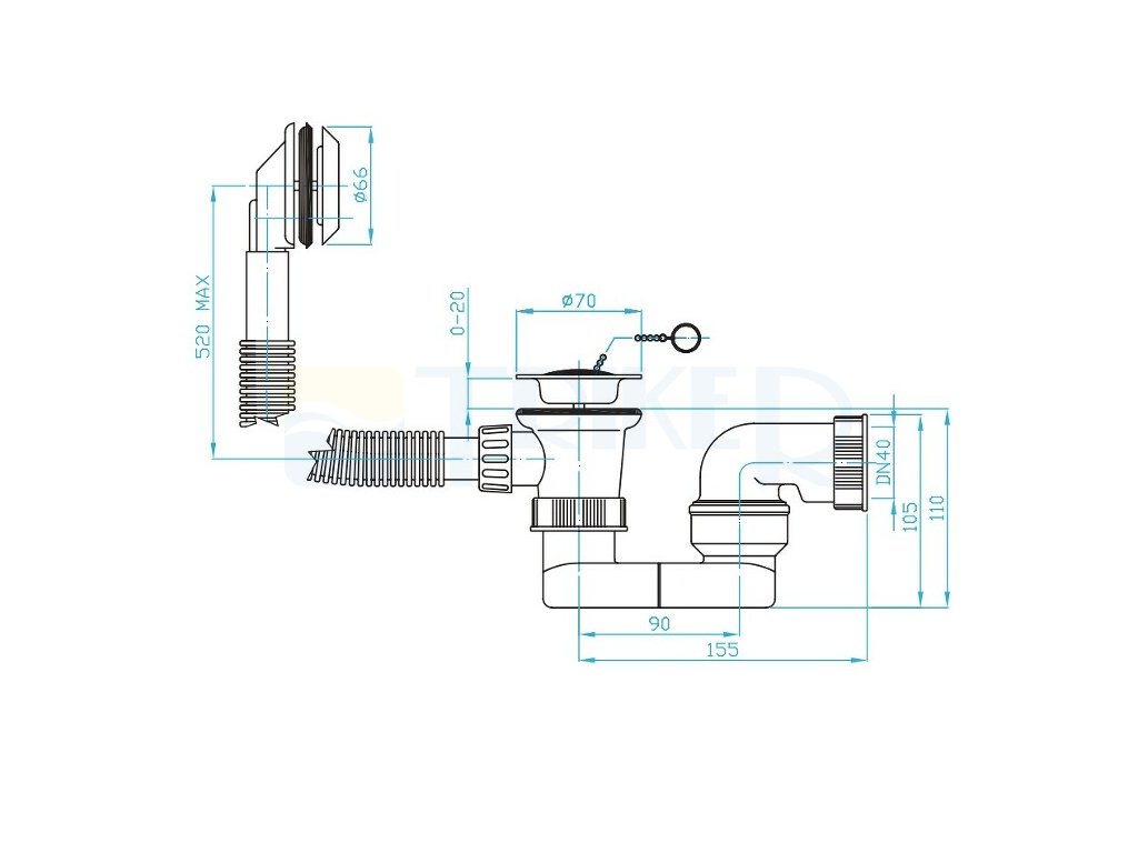 Sifon vanový s řetízkem EV10040 odpad 40mm, délka přepadu 520mm