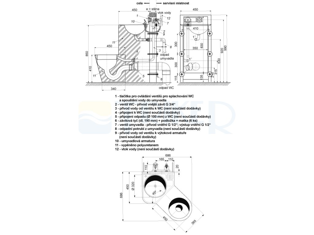 • kompaktní set WC s umyvadlem, umyvadlovou armaturou a otvorem pro • toaletní papír