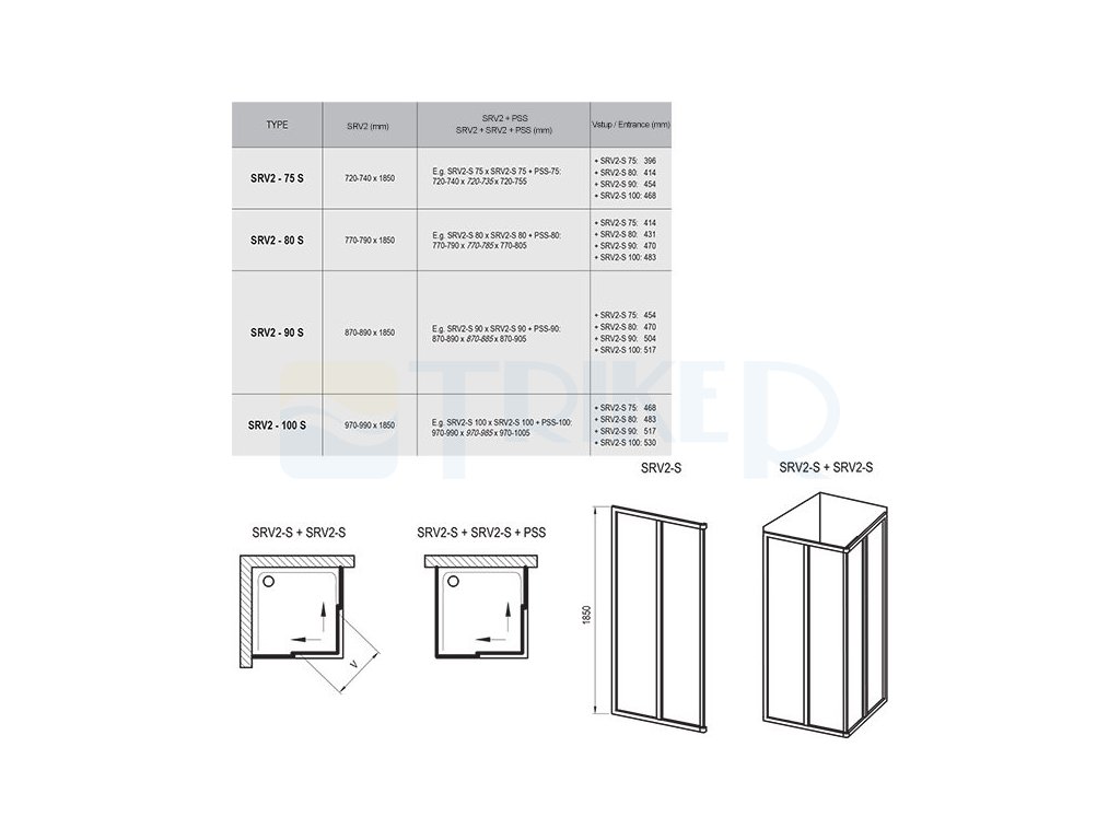 K vytvoření celého koutu jsou zapotřebí dva kusy posuvných dveří SRV2-S. Kombinací různých rozměrů obou dílů získáte čtvercovou nebo obdélníkovou variantu koutu. (např. 75 x 90 cm, 90 x 90 cm, 80 x 100 cm atd.) Montuje se do obloženého rohu koupelny na vaničky RAVAK