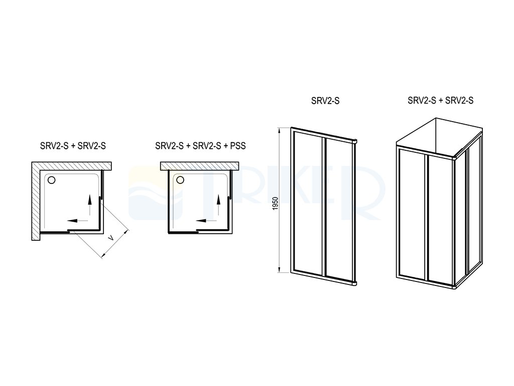 K vytvoření celého koutu jsou zapotřebí dva kusy posuvných dveří SRV2-S. Kombinací různých rozměrů obou dílů získáte čtvercovou nebo obdélníkovou variantu koutu. (např. 75 x 90 cm, 90 x 90 cm, 80 x 100 cm atd.) Montuje se do obloženého rohu koupelny na vaničky RAVAK