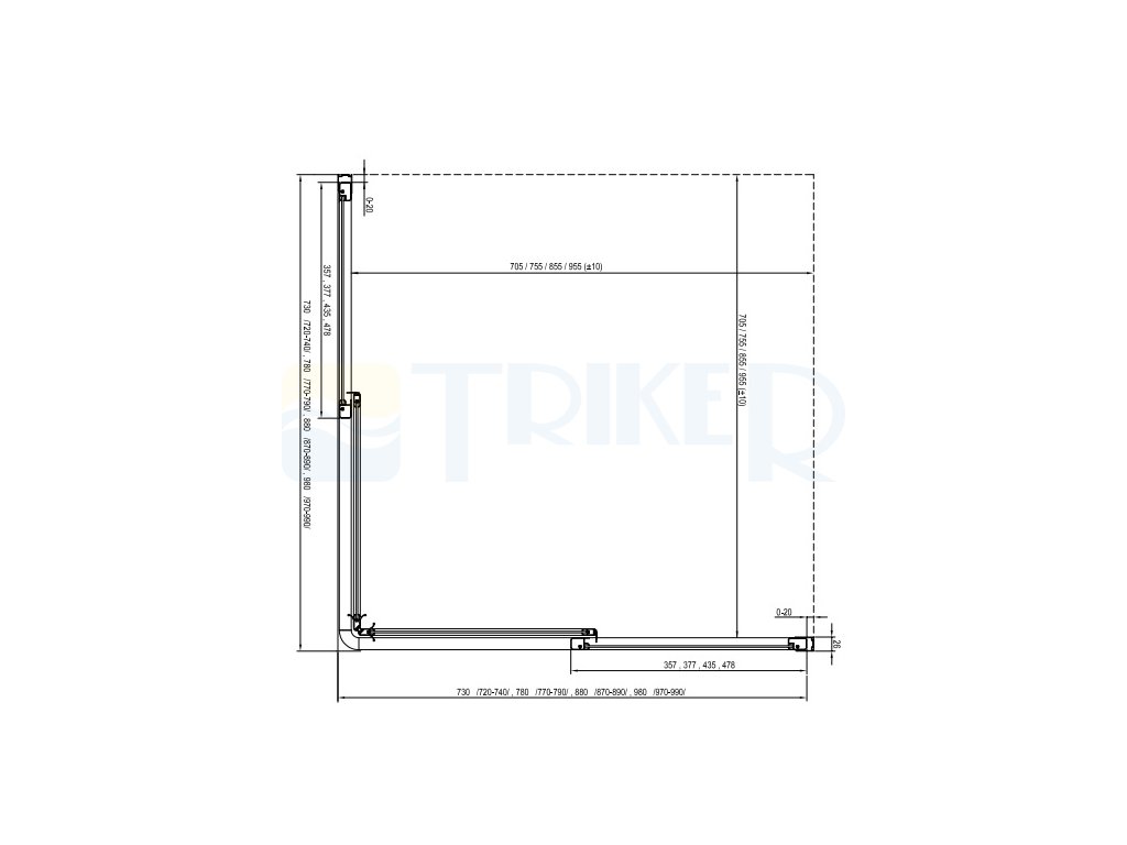 K vytvoření celého koutu jsou zapotřebí dva kusy posuvných dveří SRV2-S. Kombinací různých rozměrů obou dílů získáte čtvercovou nebo obdélníkovou variantu koutu. (např. 75 x 90 cm, 90 x 90 cm, 80 x 100 cm atd.) Montuje se do obloženého rohu koupelny na vaničky RAVAK