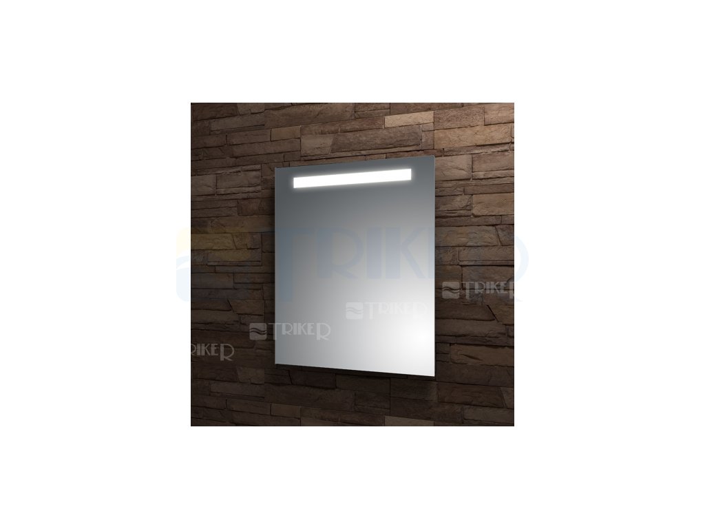 Hranaté zrcadlo LED páskem umístěným v kovovém odražeči pod vypískovanými pruhy širokými 35 mm. Jednotlivé diody nejsou díky odražeči patrné. Elektroinstalace je skrytá v hliníkovém rámu o průřezu 30 x 20 mm.